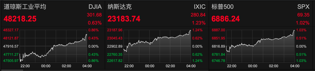 当地时间4月13日,美股三大指数低开后一路走高。截至收盘,道指涨301.68点,涨幅0.63%,报48218.25点;纳指涨280.84点,涨幅1.23%,报23183.74点;标普500指数涨69.35点,涨幅1.02%,报6886.24点。