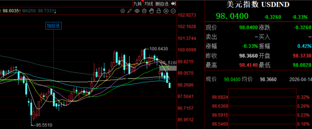 值得一提的是,美元指数跌至6周低位,跌破所有均线。