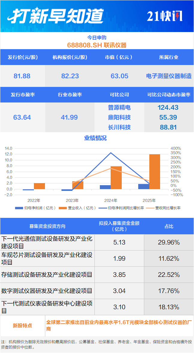4月14日,可申购科创板的联讯仪器(688808.SH)。该公司是国内领先的高端测试仪器设备企业,主营业务为电子测量仪器和半导体测试设备的研发、制造、销售及服务,专业为全球高速通信和半导体等领域用户提供高速率、高精度、高效率的核心测试仪器设备。