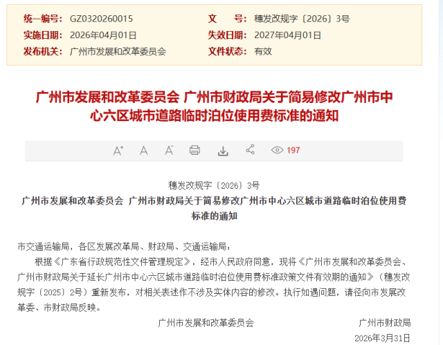 这份通知表示,根据《广东省行政规范性文件管理规定》,经市人民政府同意,现将《广州市发展和改革委员会、广州市财政局关于延长广州市中心六区城市道路临时泊位使用费标准政策文件有效期的通知》(穗发改规字〔2025〕2号)重新发布,对相关表述作不涉及实体内容的修改。通知自2026年4月1日起实施,有效期1年。