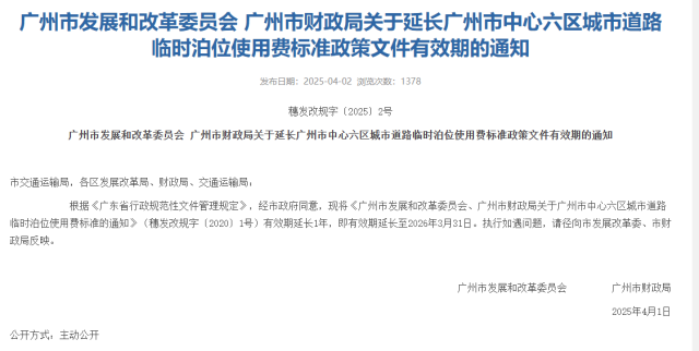 2025年4月,广州市发展改革委就曾发布《广州市发展和改革委员会 广州市财政局关于延长广州市中心六区城市道路临时泊位使用费标准政策文件有效期的通知》(穗发改规字〔2025〕2号),有效期延长1年,即有效期延长至2026年3月31日。