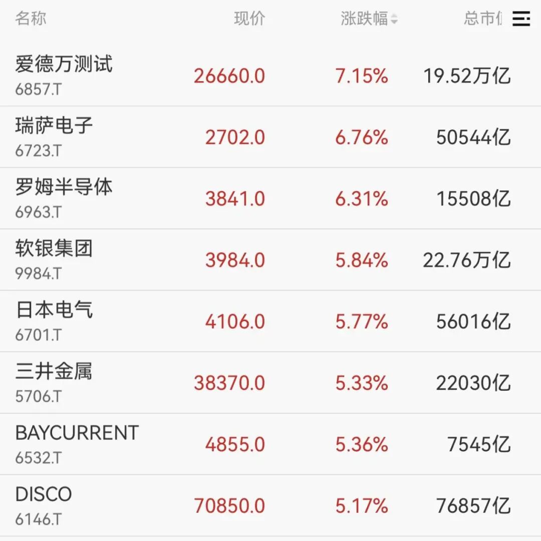 个股方面,爱德万测试、瑞萨电子、罗姆半导体等均涨超6%。
