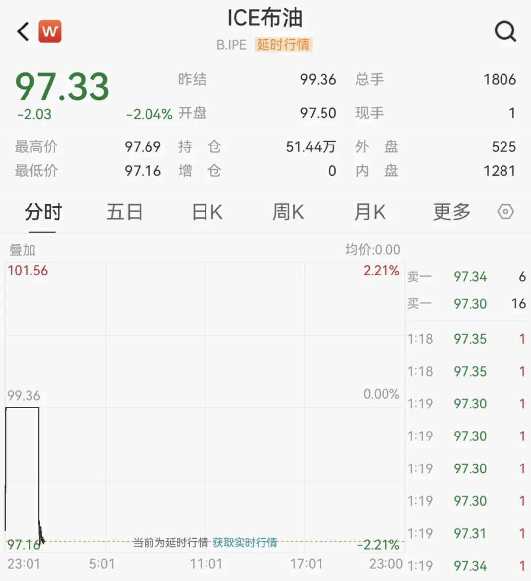 4月14日,国际原油期货直线下跌,布伦特原油日内跌超2%,现报97.33美元/桶。