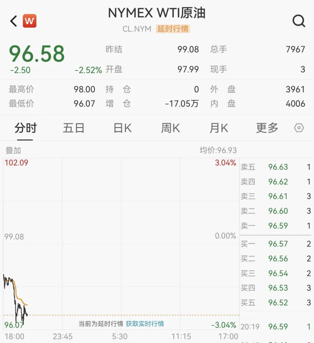 WTI原油期货一度跌超3%,现报96.58美元/桶。