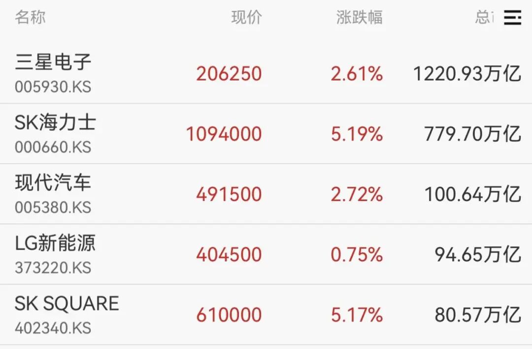 权重股方面,SK海力士涨超5%,三星电子、现代汽车、SK SQUARE等纷纷走高。