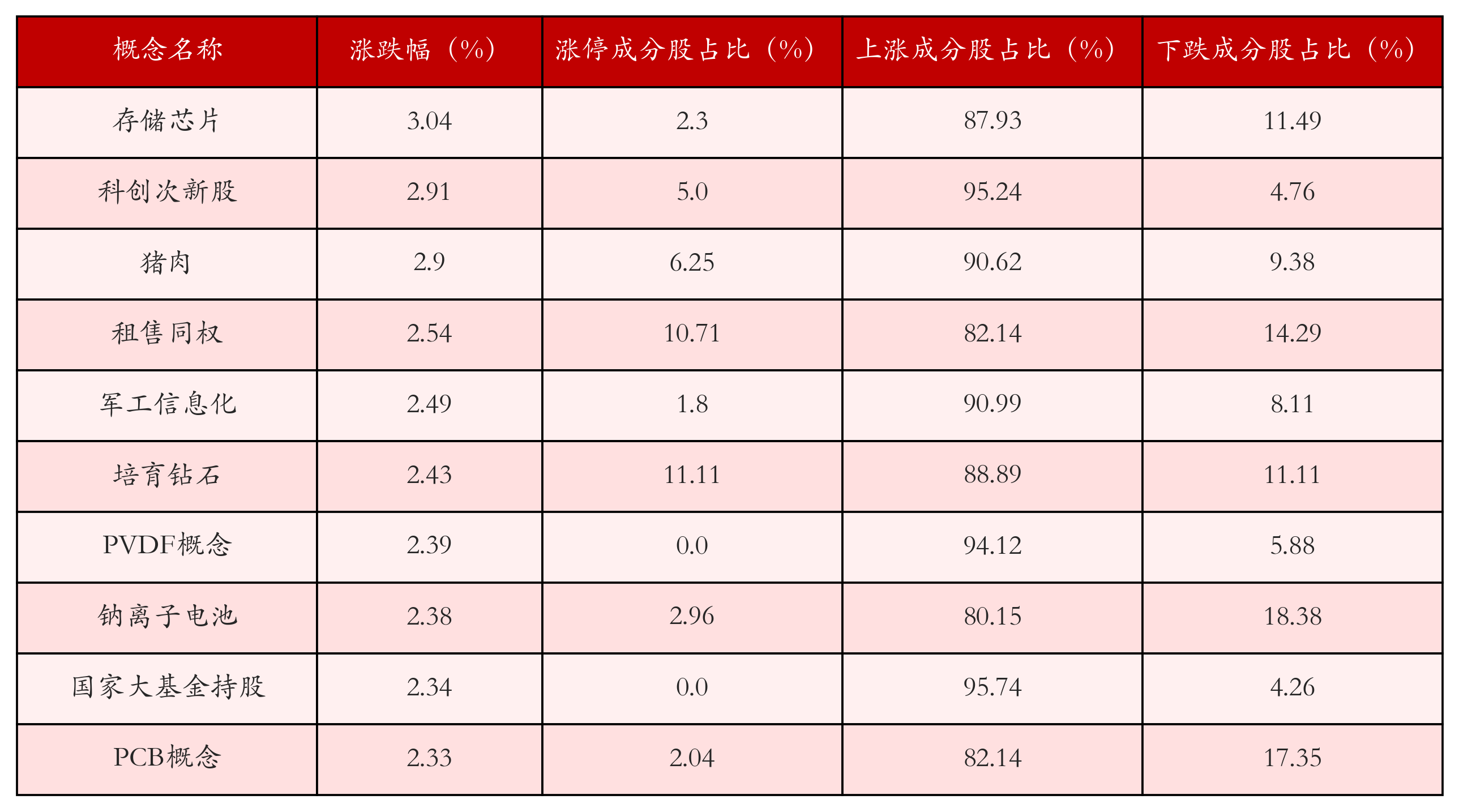 根据A股概念涨跌幅与所对应的股票池综合分析,涨幅靠前的三个概念板块分别为:存储芯片、科创次新股与猪肉。排名前10位的概念板块相关数据见下表:
