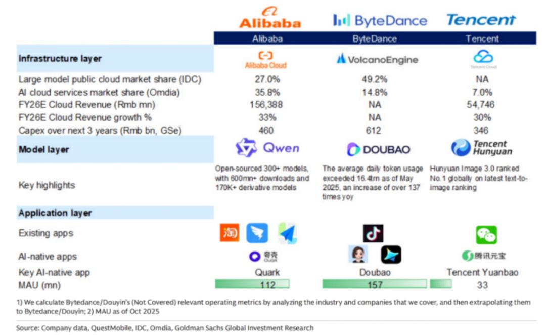 根据高盛之前的报告,阿里在企业端外部AI云的收入规模上领先,市占率达到35.8%,字节跳动为14.8%,腾讯为7%。