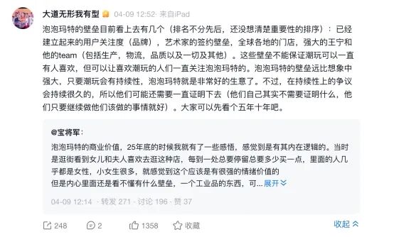 段永平总结泡泡玛特的核心壁垒:已经建立起来的用户关注度(品牌)、艺术家的签约壁垒、全球各地的门店、王宁和他的团队(包括生产、物流、品质等)。他还表示泡泡玛特的壁垒“远比想象中的强大”。