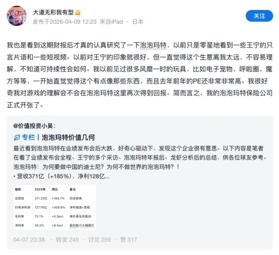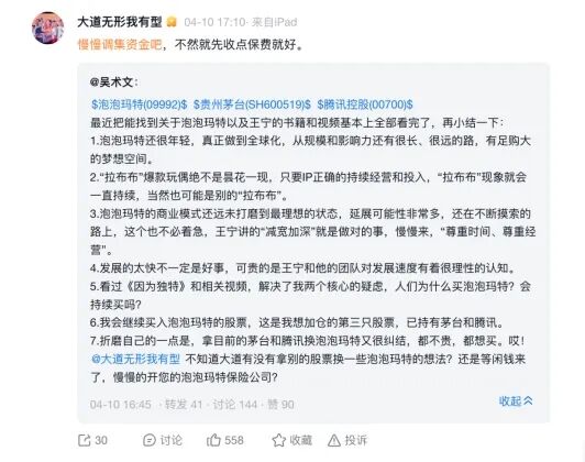 2026年4月10日,段永平针对泡泡玛特的投资表态:“慢慢调集资金吧,不然就先收点保费就好。”4月11日,他在回复网友提问时进一步补充,会在未来逐步收集“想要的份额”。