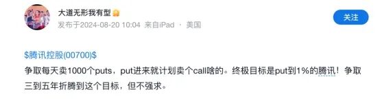 “开保险公司”是段永平对卖出看跌期权(卖Put)建仓方式的比喻,该策略此前已多次应用于腾讯、苹果等标的。2024年8月,段永平在分享卖出腾讯股票看跌期权的操作时,曾明确表示“只是又开了间保险公司,赚点保费而已”。