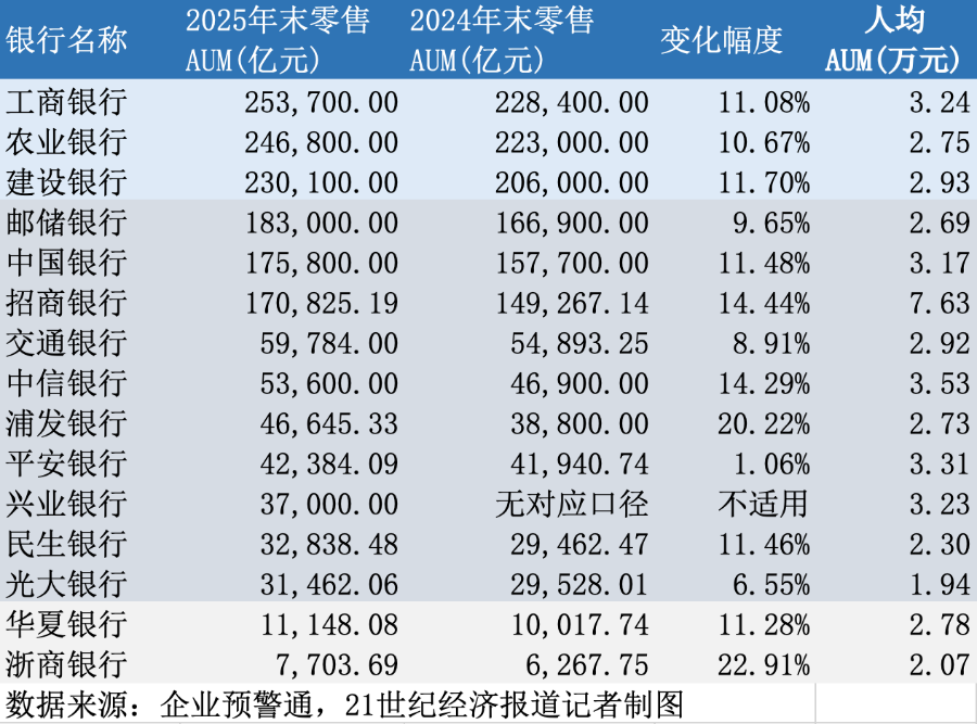 2025年年报显示,绝大多数国有银行、股份制银行的零售AUM去年实现正增长,目前已分化出三个梯队。