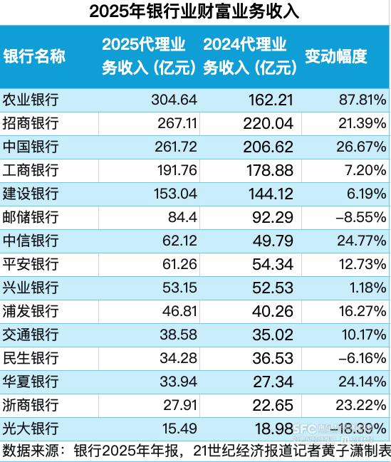 据21世纪经济报道记者统计,六大国有银行和九家上市股份行共计15家银行中,有12家在2025年实现了财富业务的正增长。15家银行的代理业务收入合计超过1600亿元,平均增幅达21%。