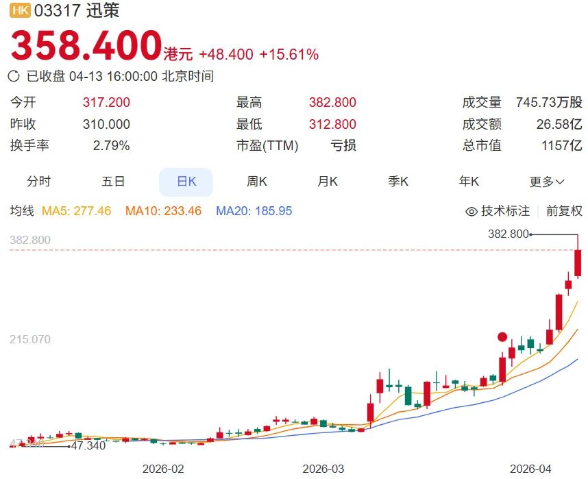 4月13日,迅策科技股价大涨15.6%,市值站上1100亿港元。其上市不足四个月,相较发行价,股价飙涨超6倍。