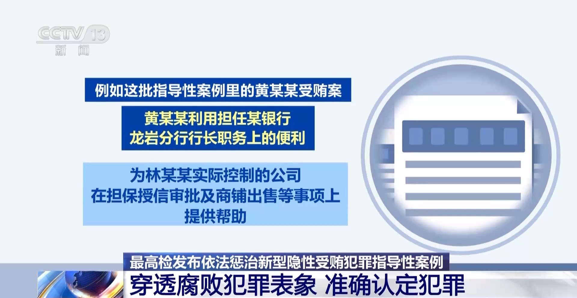 记者昨天(13日)从最高人民检察院了解到,近日最高检发布以依法惩治新型隐性受贿犯罪为主题的指导性案例,案例为检察机关准确认定各类新型受贿犯罪,不断提高反腐败穿透力提供了重要示范指引。