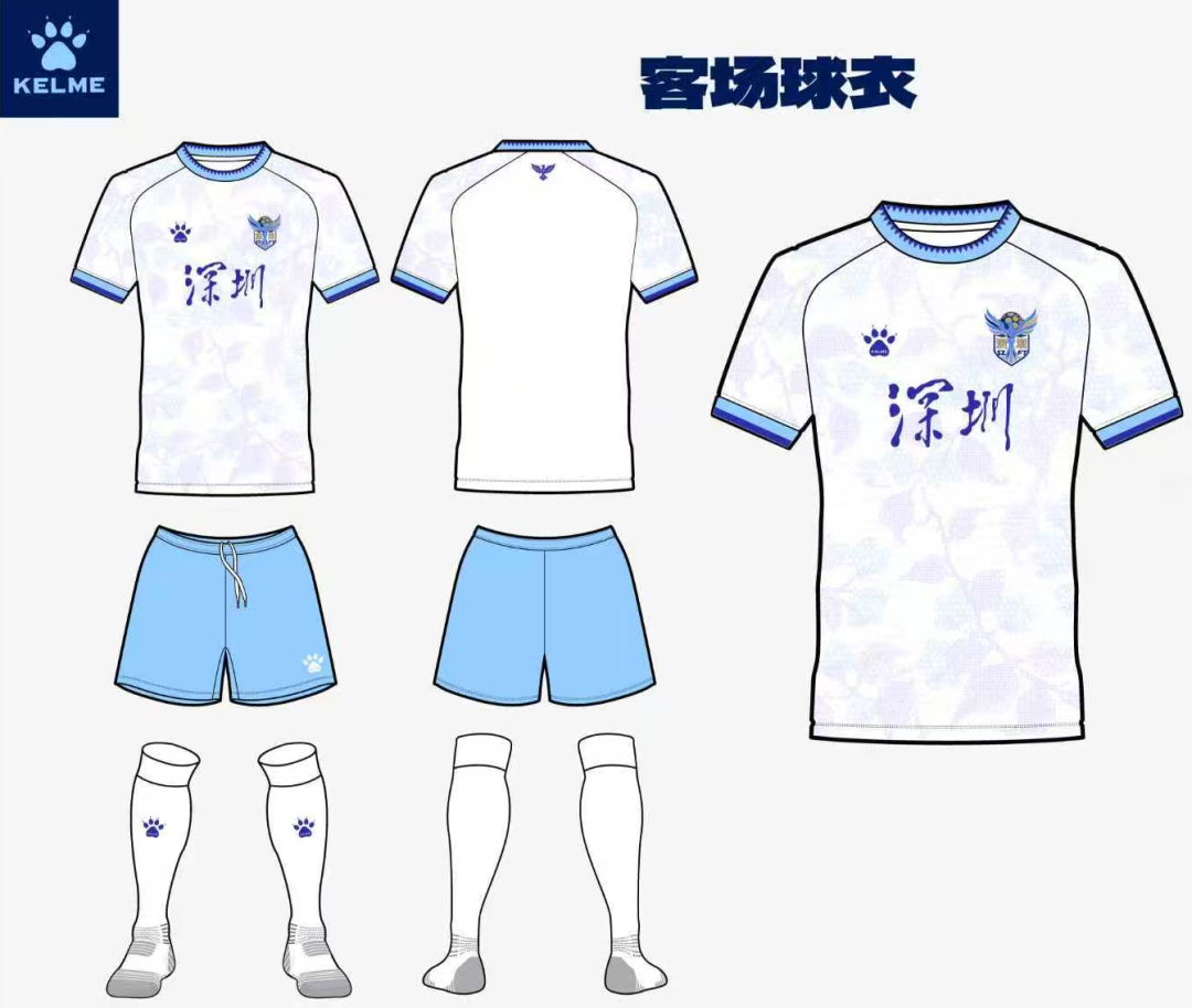 客场球衣是描绘深圳灵魂的移动数字画卷,承载“花语与代码”的双重叙事。表层以ASCII码像素化重构杜鹃花,浅蓝与浅紫交织成数据流中绽放的花海,致敬互联网产业与青年文化;底层是二进制“SHENZHEN”像素底纹,浅灰如数字脉搏,象征硬件根基与逻辑精神。科技与生机在此冷静交融。