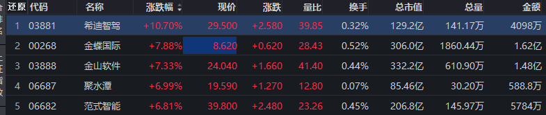 港股方面,软件板块高开震荡,希迪智驾涨超11%,金蝶国际、金山软件涨超7%