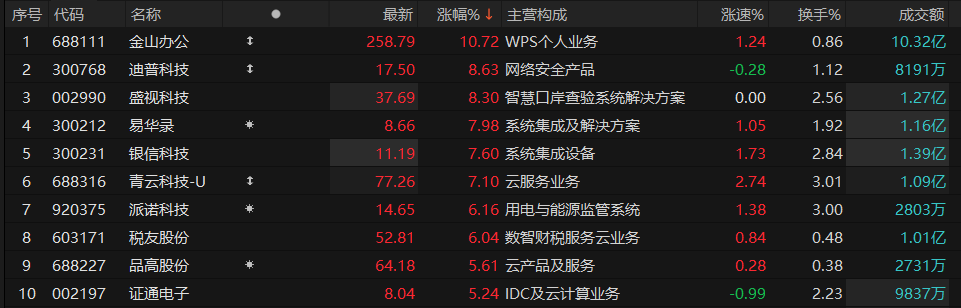 截至发稿,A股方面,计算机软件板块高开,金山办公涨近11%,迪普科技涨近9%,易华录、银信科技、盛视科技等跟涨。