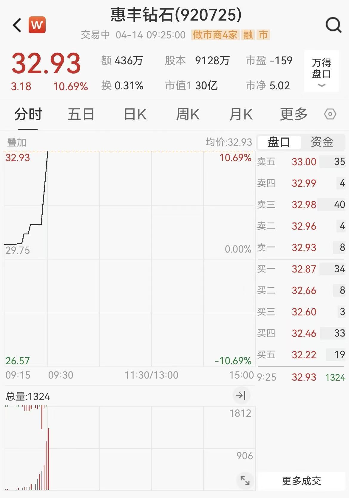4月14日,培育钻石集体高开,惠丰钻石盘中涨超10%,黄河旋风、力量钻石等相关个股同步走强。
