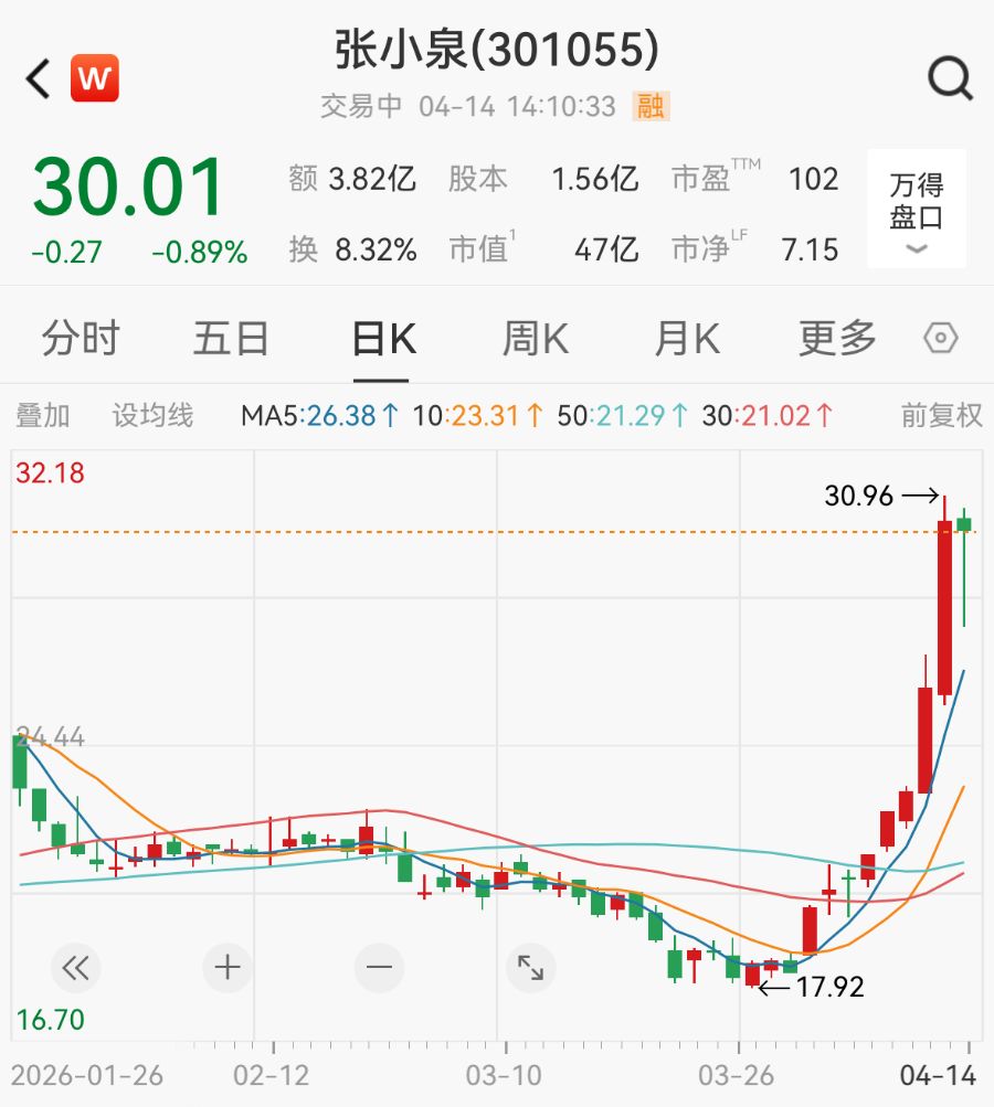 截至4月14日14:10,张小泉股价报30.01元/股,跌0.89%。