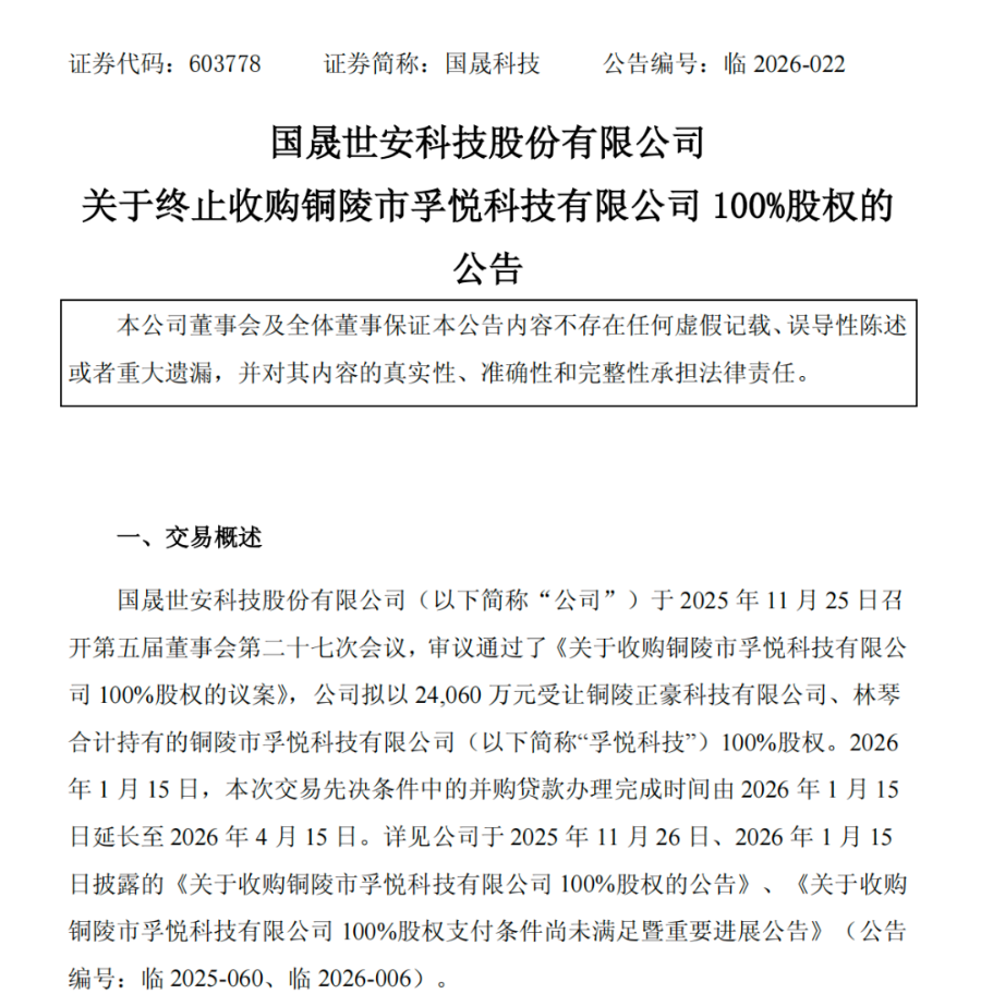 4月13日晚间,国晟科技(603778)公告称,4月13日,公司召开第五届董事会第二十九次会议,审议通过了关于终止收购铜陵市孚悦科技有限公司(下称“孚悦科技”)100%股权的议案,本事项无需经过股东会审议。