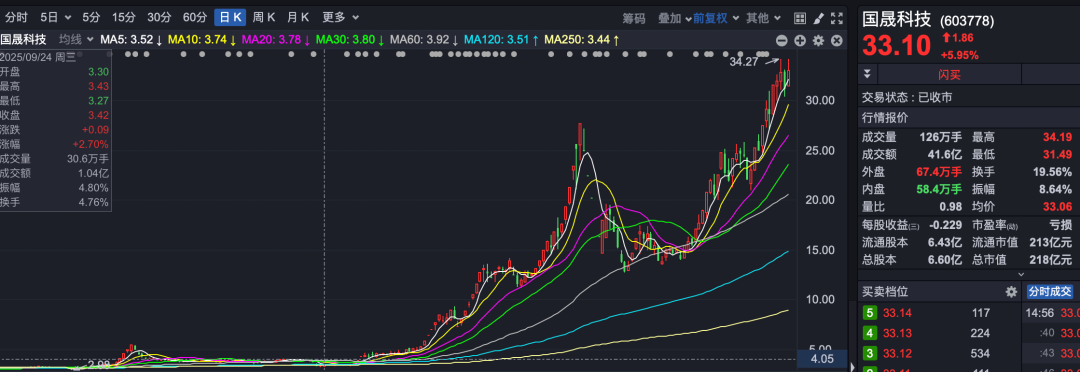 值得注意的是,自2025年9月以来,国晟科技股价大幅上涨,从3.3元/股左右涨至目前的33.1元/股,成为10倍大牛股,最新市值218亿元。
