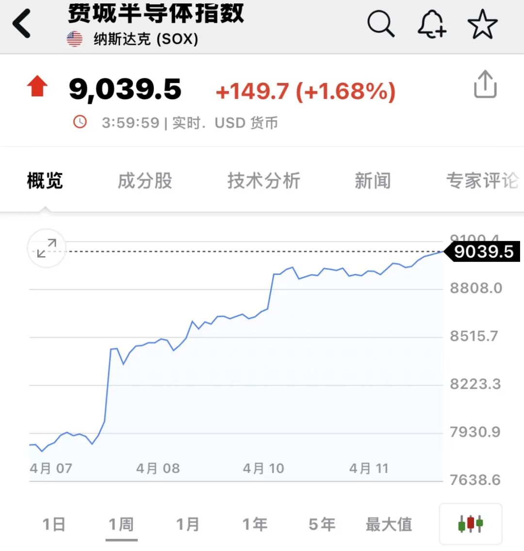 美东时间4月13日,中东局势缓和预期增强,美股三大指数集体收高,纳指实现九连涨,标普500指数收复年内跌幅。此外,费城半导体指数历史性突破9000点。