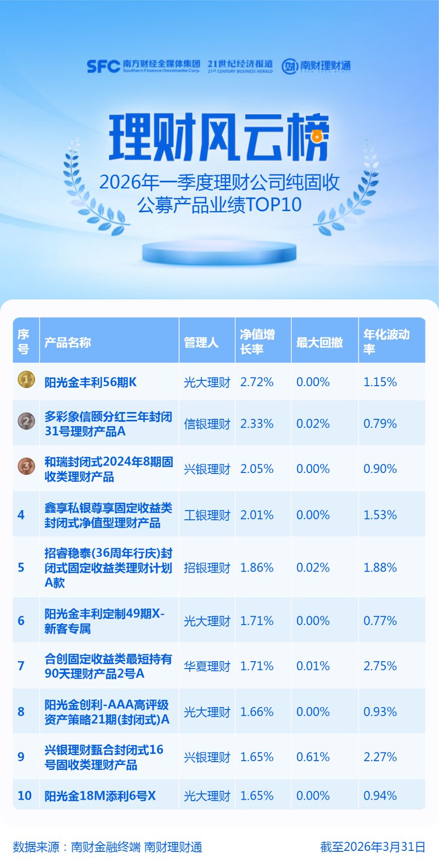 产品统计范围为理财公司发行的公募纯固收类产品,统计截止日期为2026年3月31日,统计区间为2026年一季度(1月1日至3月31日,下同)。