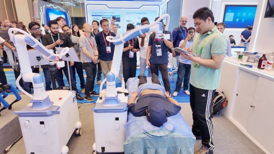 在咖啡区,机器人正以人手般的柔顺动作完成一杯咖啡拉花;理疗体验区里,体验者闭目躺卧,机械臂沿着经络走向施以恒定力道,力道之精准让围观者啧啧称奇;新零售展台前,扫码下单、机械臂抓取、冰淇淋递出,全程仅需40秒。