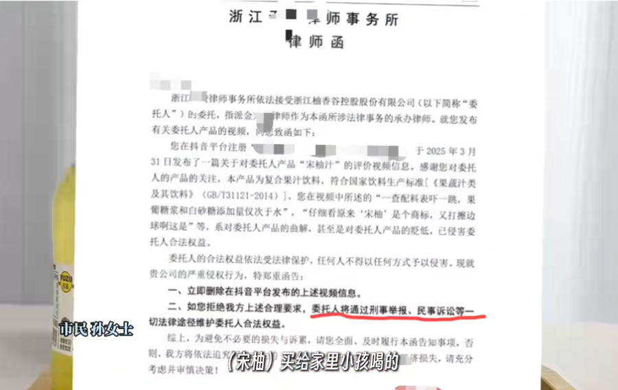 更讽刺的是,据媒体报道,消费者因“花纯果汁的钱,买了一瓶柚子味的糖水”,制作了一条短视频,如实说出了自己的发现。但视频发布没几天,就收到了柚香谷委托律师事务所发来的律师函,函中称她的表述是对产品的曲解和贬低,侵害了厂家的合法权益,不仅要求删除视频,还暗示将采取刑事手段追究其责任。