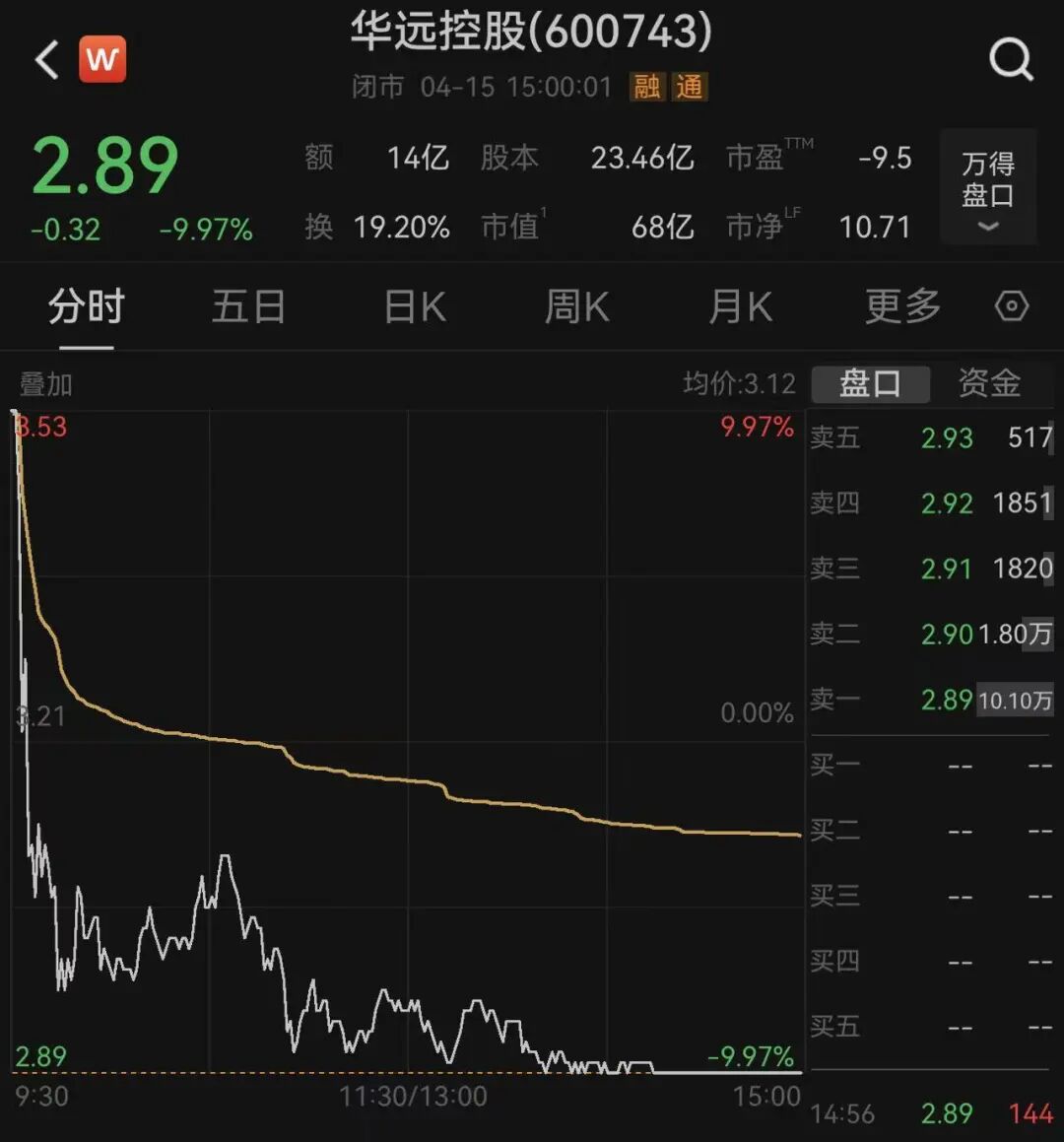 4月15日午后,高位人气股华远控股(SH600743)触及跌停,上演“天地板”行情,随后该股在跌停附近反复震荡,截至发稿,该股仍逼近跌停。该股此前走出6连板,今早以涨停价开盘。