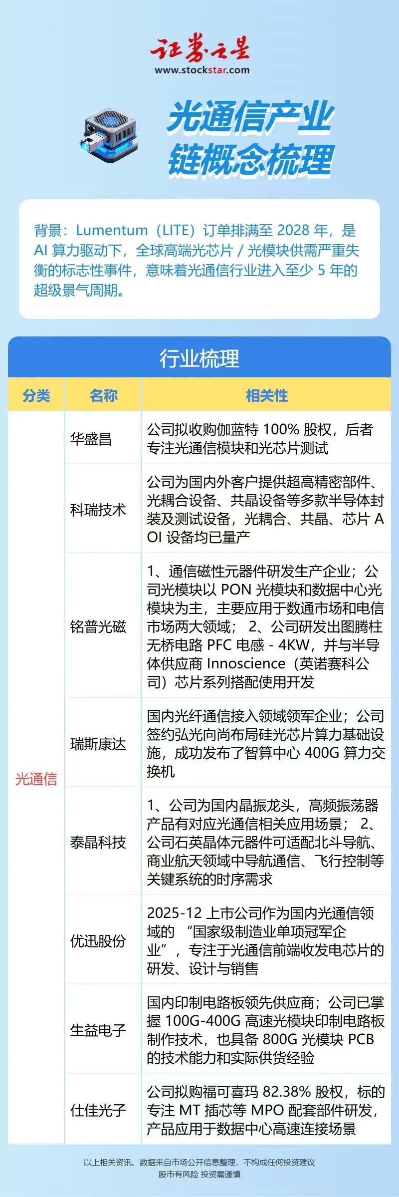 背景:Lumentum(LITE)订单排满至2028年,是AI算力驱动下,全球高端光芯片/光模块供需严重失衡的标志性事件,意味着光通信行业进入至少5年的超级景气周期。