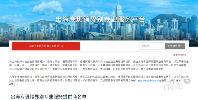 目前,跨界别专业服务平台已于3月20日随“出海专班”专题网页一并推出。此平台刚完善服务商数据库,优化操作界面,以深化配对功能,并加设自动联系服务供应商功能,提供便捷流畅的一站式配对服务。贸发局计划于下半年加入更多服务商,并持续优化平台及配对功能,为内地企业提供更全面的服务。