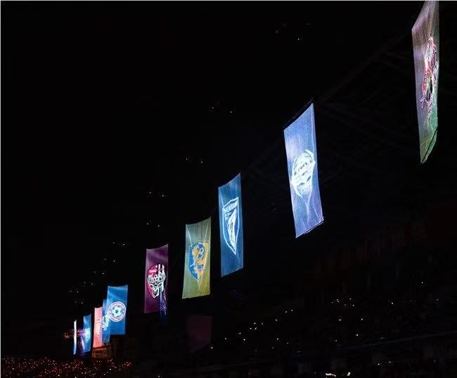空中,驭风者科技的13架大载重表演无人机,吊载13块3×6米柔性发光屏,组成空中矩阵,每块屏幕清晰呈现“江苏十三太保”球队队旗,创造了“最多无人机挂载飞屏编队飞行”世界纪录。