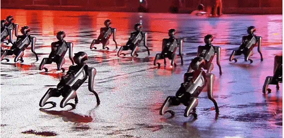 今年的“苏超”开幕式上,魔法原子的200台四足机器狗与90台人形机器人组成的“钢铁军团”,在雨中,完成了一场全球已知规模最大、环境最复杂的户外群控表演。