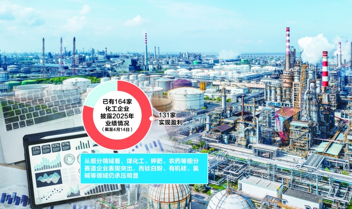 Choice数据显示,截至4月14日,已有164家化工企业披露2025年业绩情况(包括业绩预告)。其中,131家公司实现盈利,59家盈利企业实现归母净利润同比增长。从细分领域看,煤化工、钾肥、农药等细分赛道企业表现突出,而钛白粉、有机硅、氯碱等领域仍承压明显。