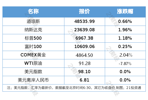 纽约股市三大股指4月14日上涨。截至当天收盘,道琼斯工业平均指数比前一交易日上涨317.74点,收于48535.99点,涨幅为0.66%;标准普尔500种股票指数上涨81.14点,收于6967.38点,涨幅为1.18%;纳斯达克综合指数上涨455.35点,收于23639.08点,涨幅为1.96%。