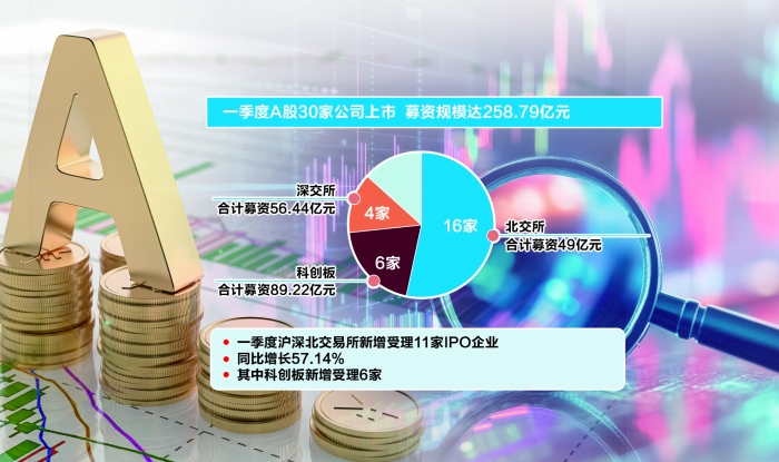 2026年一季度的IPO市场迎来一批“新生力量”。据统计,一季度,A股完成上市发行的公司共计30家,较去年同期增加3家;IPO募资规模达到258.79亿元,同比增长近六成。单个IPO项目融资能力显著提升,主要集中在电子、高端装备、新材料、新能源等新质生产力领域。