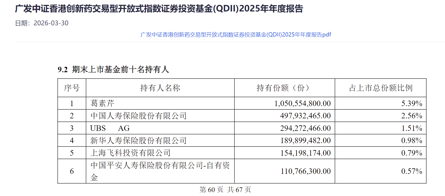 除了葛素芹以外,在广发中证香港创新药ETF的前十大持有人中,截至2025年底,中国人寿位列第二大持有人,持有份额为4.98亿份,瑞银集团、新华人寿保险股份有限公司、上海飞科投资有限公司持有份额均超过1.5亿份。