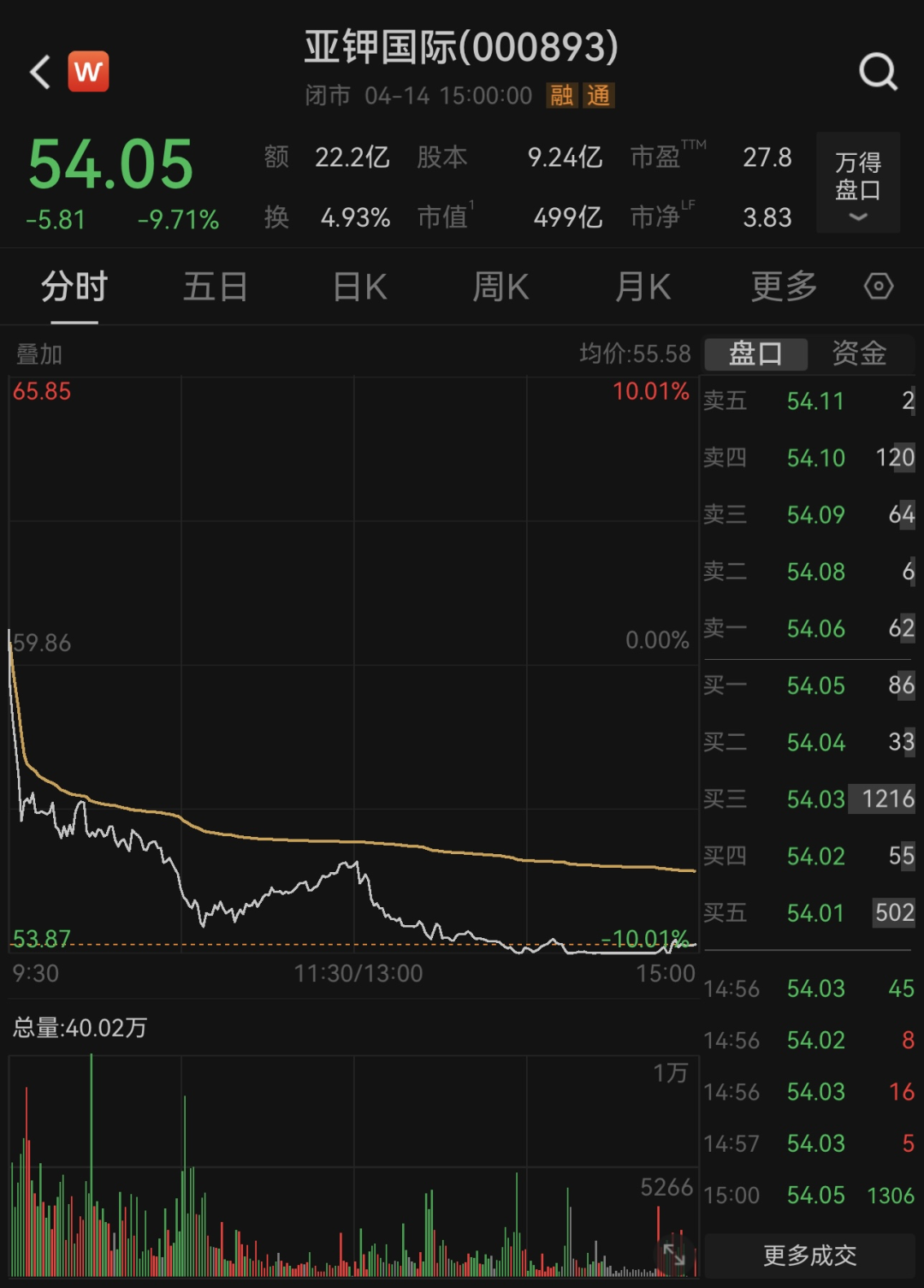 4月14日,受上述两则 “小作文” 影响, 开盘后 亚钾国际股价迅速下跌,尾盘甚至一度跌停。亚钾国际 全天成交额高达22.2亿元,创出了近一年半来的新高。不过,从4.93%的换手率来看,亚钾国际当天的交易比较集中,大概率是主力资金的多空博弈。