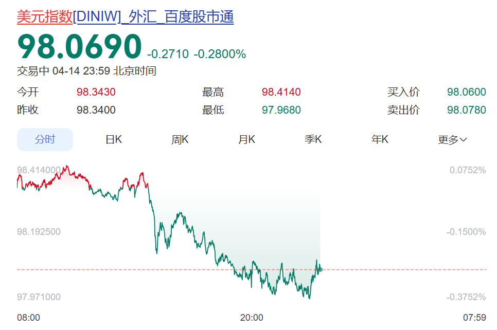美元指数跳水,一度跌破98点。