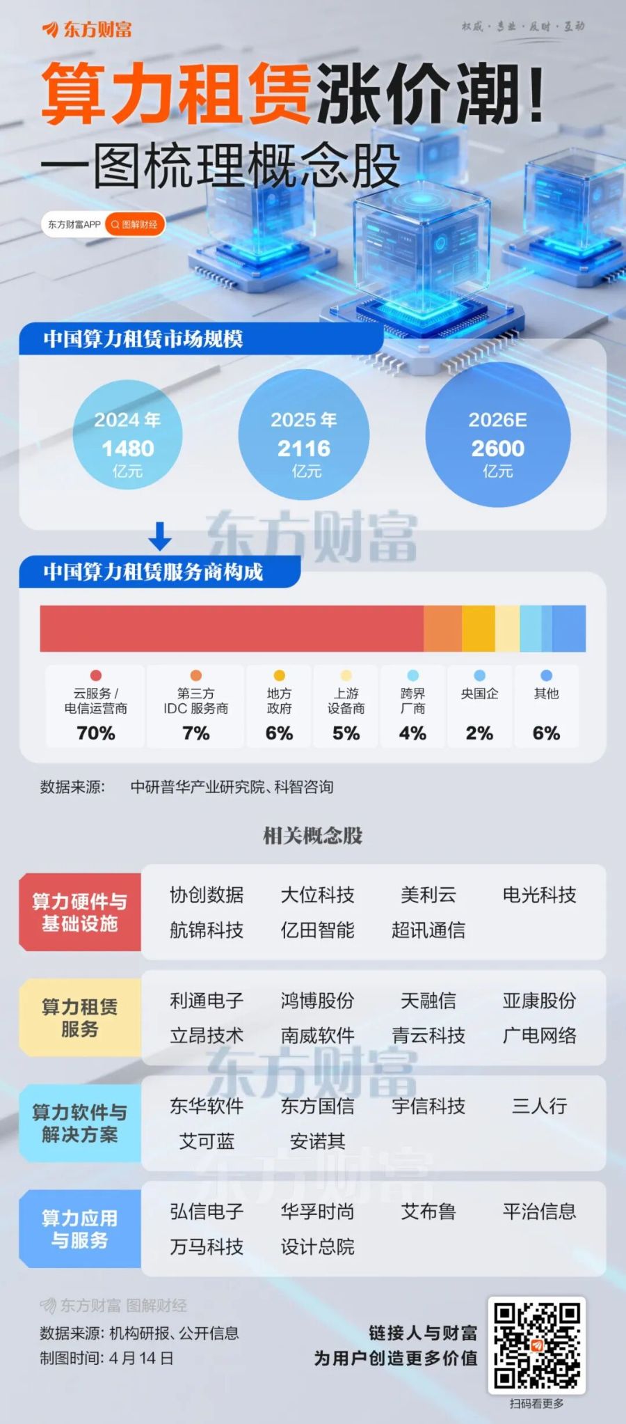 而算力租赁涨价潮也开始惠及除大厂外的其他上市公司。比如协创数据4月13日晚间披露业绩预告,公司2026年一季度归母净利润预盈6.5亿至8.5亿元,同比增长284.14%至402.33%;扣非净利润预盈6.45亿至8.45亿元,同比增长289.92%至410.82%。