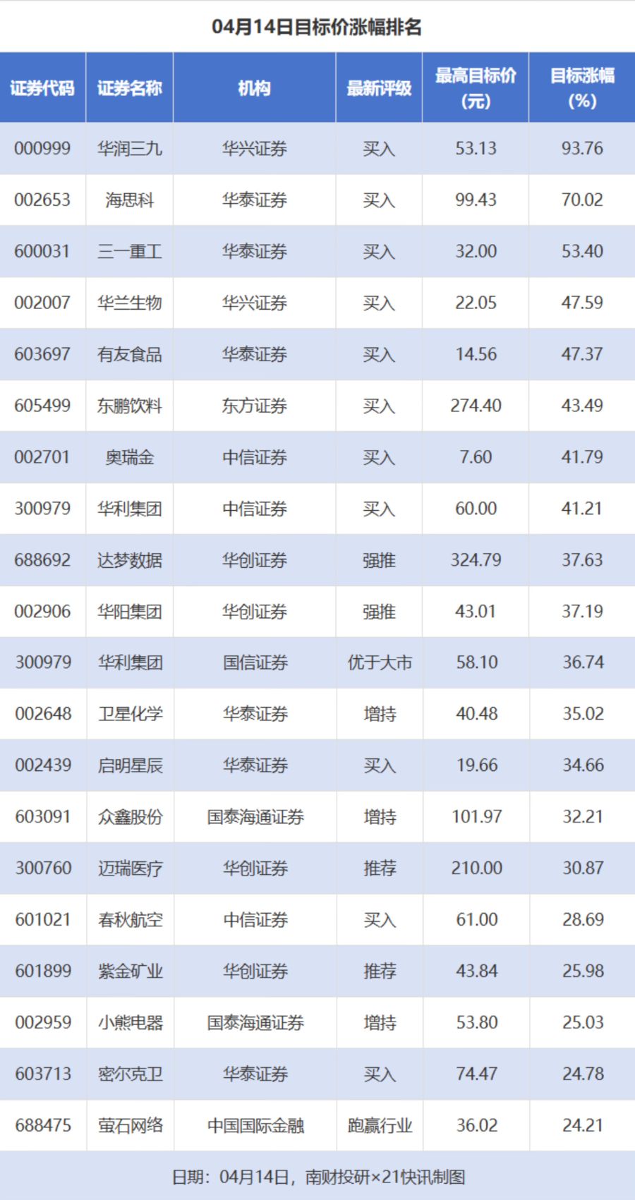 南财投研数据显示,4月14日,券商给予上市公司目标价共35次,按最新收盘价计算,目标价涨幅排名居前的公司有华润三九、海思科、三一重工,目标价涨幅分别为93.76%、70.02%、53.40%,分别属于中药、化学制药、工程机械行业。