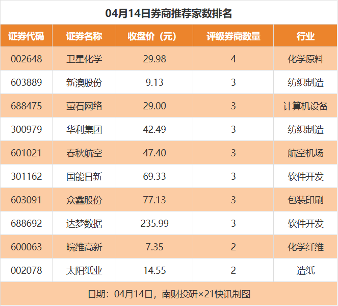从券商推荐家数来看,4月14日有86家上市公司得到券商推荐,其中卫星化学获得4家推荐,新澳股份、萤石网络等获得3家推荐。