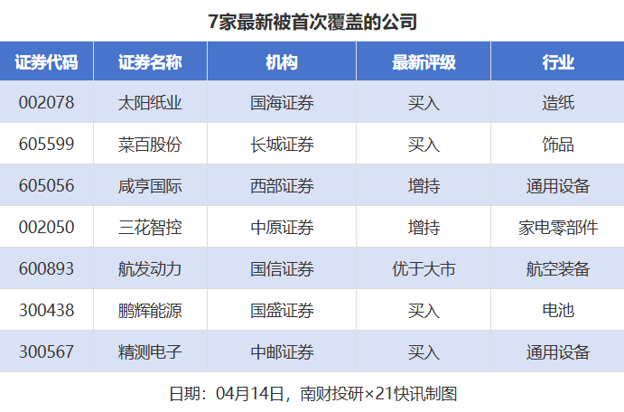 首次覆盖方面,4月14日券商共给出了7次首次覆盖,其中太阳纸业获得国海证券给予“买入”评级,菜百股份获得长城证券给予“买入”评级,咸亨国际获得西部证券给予“增持”评级,三花智控获得中原证券给予“增持”评级,航发动力获得国信证券给予“优于大市”评级。