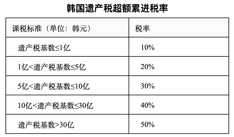 韩国的遗产税制度由《继承税及赠与税法》规定,以被继承人死亡时继承人所取得财产为课税对象,一次性扣除5亿韩元的基础扣除,再按继承人人数扣除一定份额(配偶最低可扣除5亿韩元,最高30亿韩元,每个子女可扣除5000万韩元),丧葬费、慈善捐赠等也可以在税前扣除。剩余的遗产作为纳税基数,按超额累进税率征收遗产税,超过30亿韩元的部分,税率达50%。