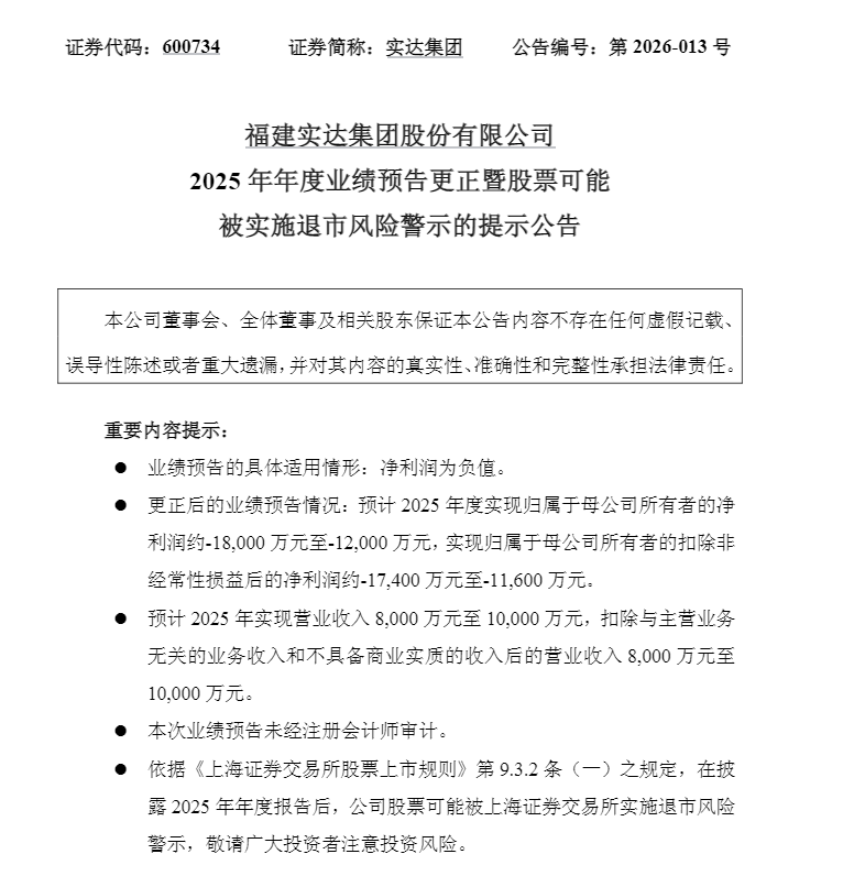 同时,实达集团提示,公司预计2025年度经审计的利润总额、净利润、扣除非经常性损益后的净利润孰低者为负值且营业收入低于3亿元。根据《上海证券交易所股票上市规则》第9.3.2条(一)之规定, 在披露2025年年度报告后,公司股票可能被上海证券交易所实施退市风险警示(股票简称前冠以“*ST”字样)。