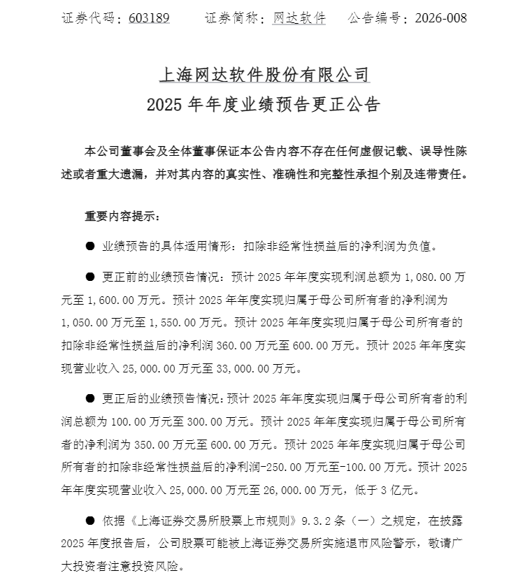 网达软件称,根据相关规定,公司股票可能被实施退市风险警示(冠以“*ST”字样)。若触及该情形,公司股票将于2025年年度报告披露日起开始停牌,并在停牌后5个交易日内被实施退市风险警示。公司提醒投资者注意投资风险,具体数据以正式披露的经审计年报为准。
