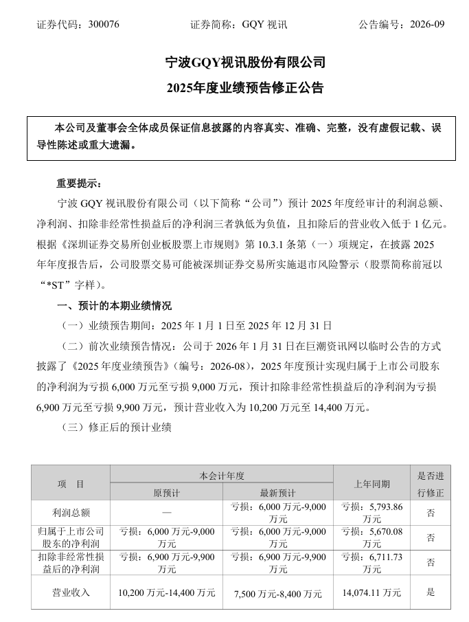 GQY视讯发布公告称,预计2025年度归属于上市公司股东的净利润为亏损6000万元至亏损9000万元。业绩变动原因系子公司不纳入合并报表范围及部分业务由总额法调整为净额法核算,导致营业收入修正为7500万元—8400万元,扣除后营业收入低于1亿元。公司预计2025年度经审计的利润总额、净利润、扣除非经常性损益后的净利润三者孰低为负值,且扣除后的营业收入低于1亿元。