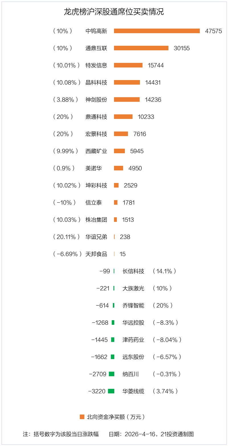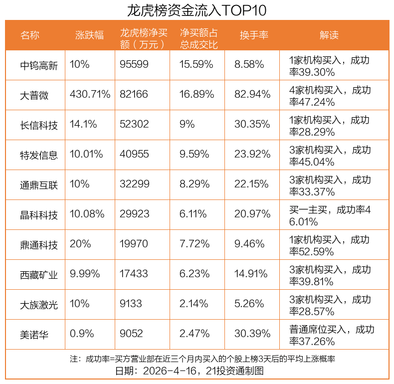 4月16日,上证指数上涨0.7%,深证成指上涨2.05%,创业板指上涨3.17%。盘后龙虎榜数据显示,共有49只个股因当日异动登上龙虎榜,资金净流入最多的是中钨高新(000657.SZ),达9.56亿元。