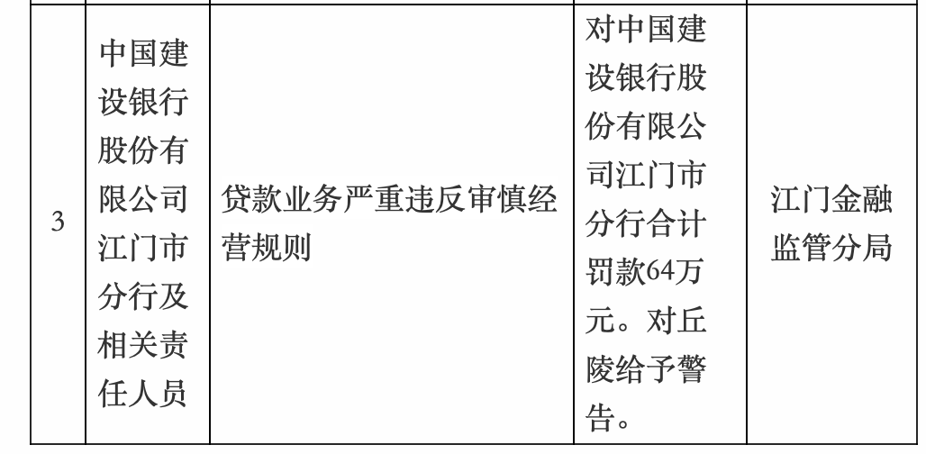 4月15日,国家金融监督管理总局江门监管分局行政处罚信息公示列表显示,中国建设银行江门市分行,因贷款业务严重违反审慎经营规则,被罚款64万元。对丘陵给予警告。